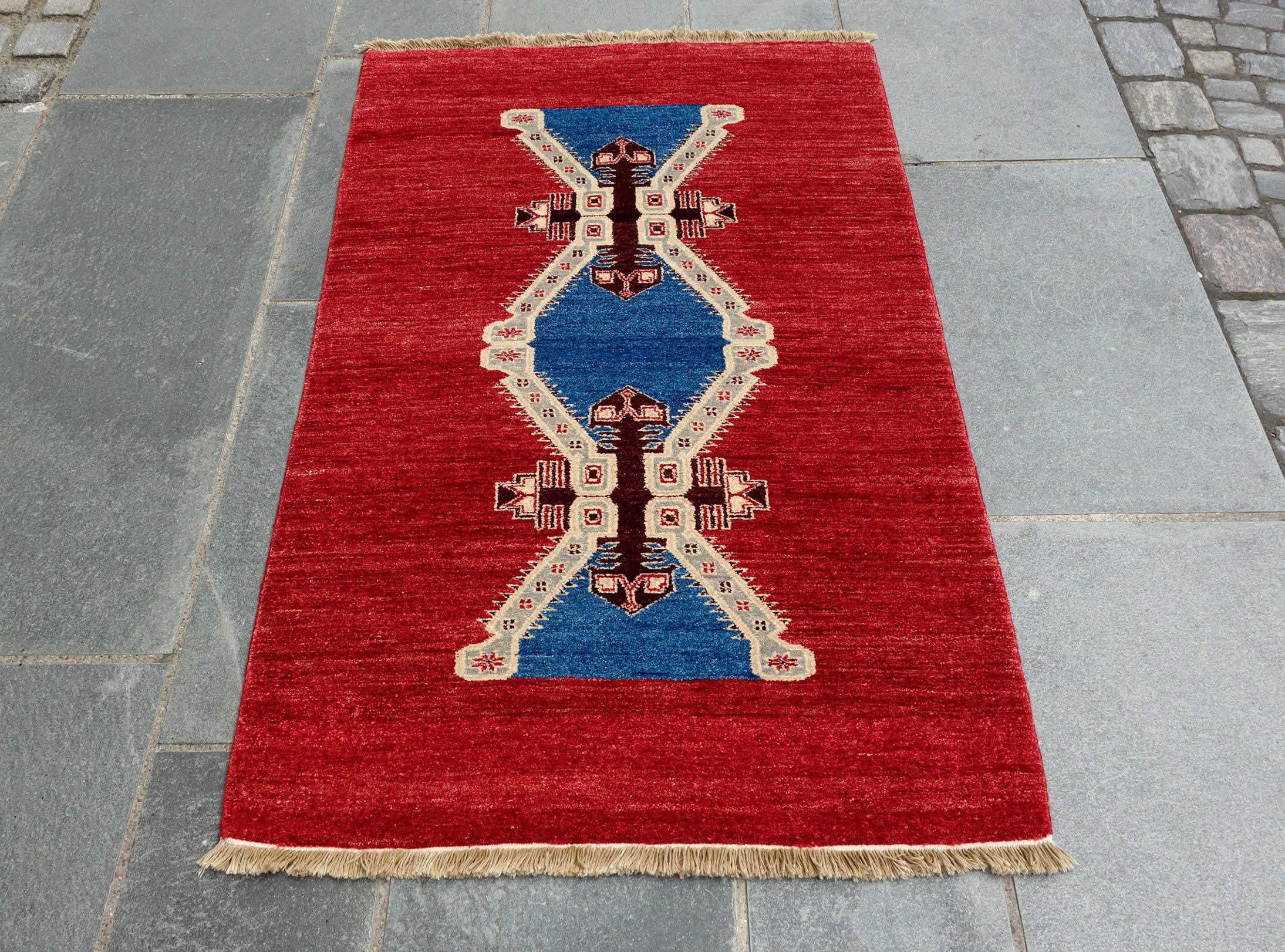 Afghan Gabbeh. Gabbeh er navnet på nomadetepper , som betyr bamseunge. De har tykk myk ull og er knyttet på frihånd i enkle mønster. De er knyttet av håndspunnet ull og naturlig plantefarget