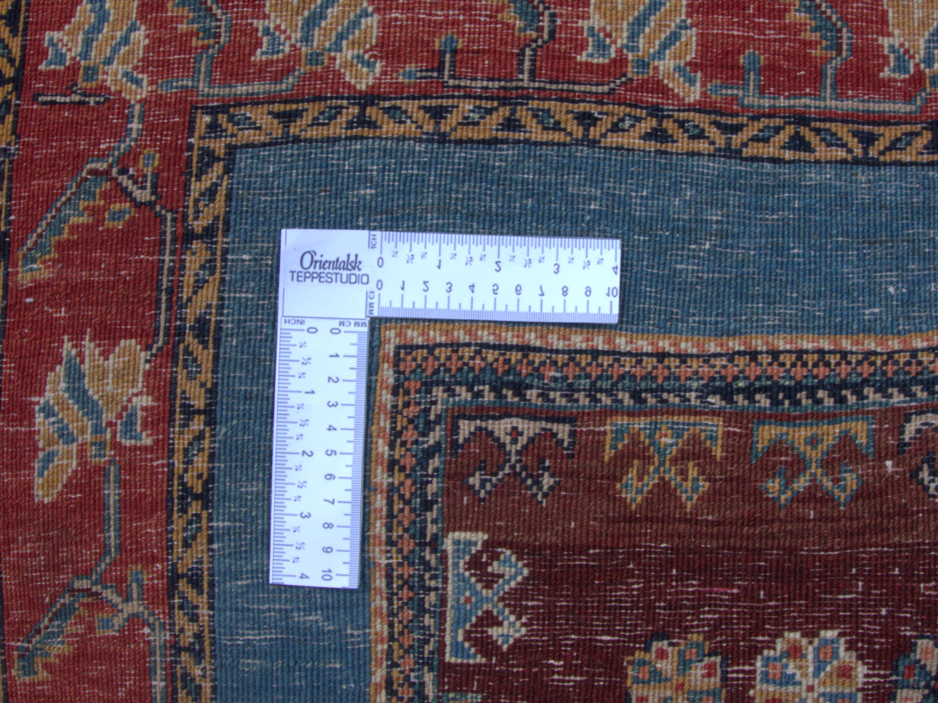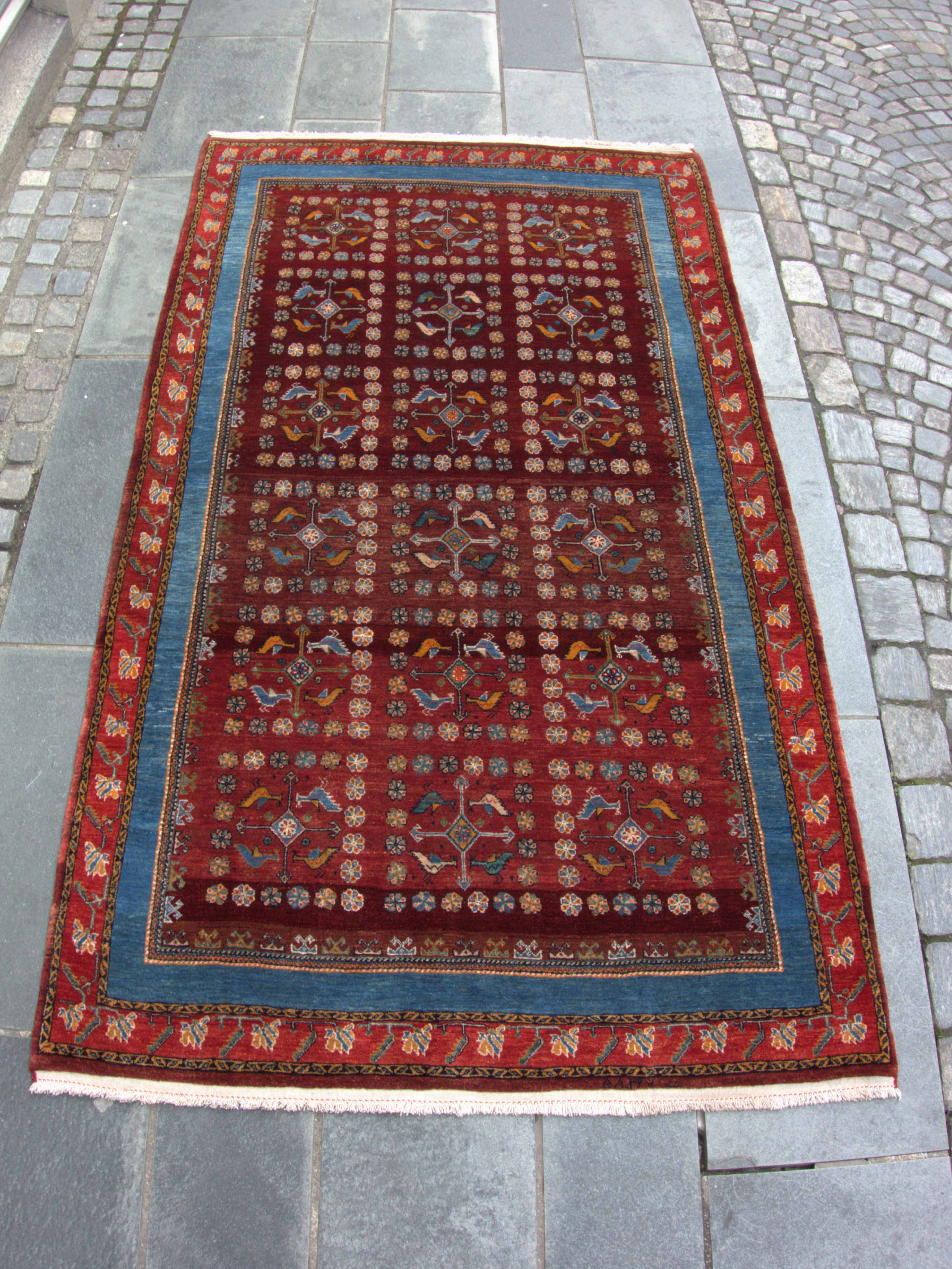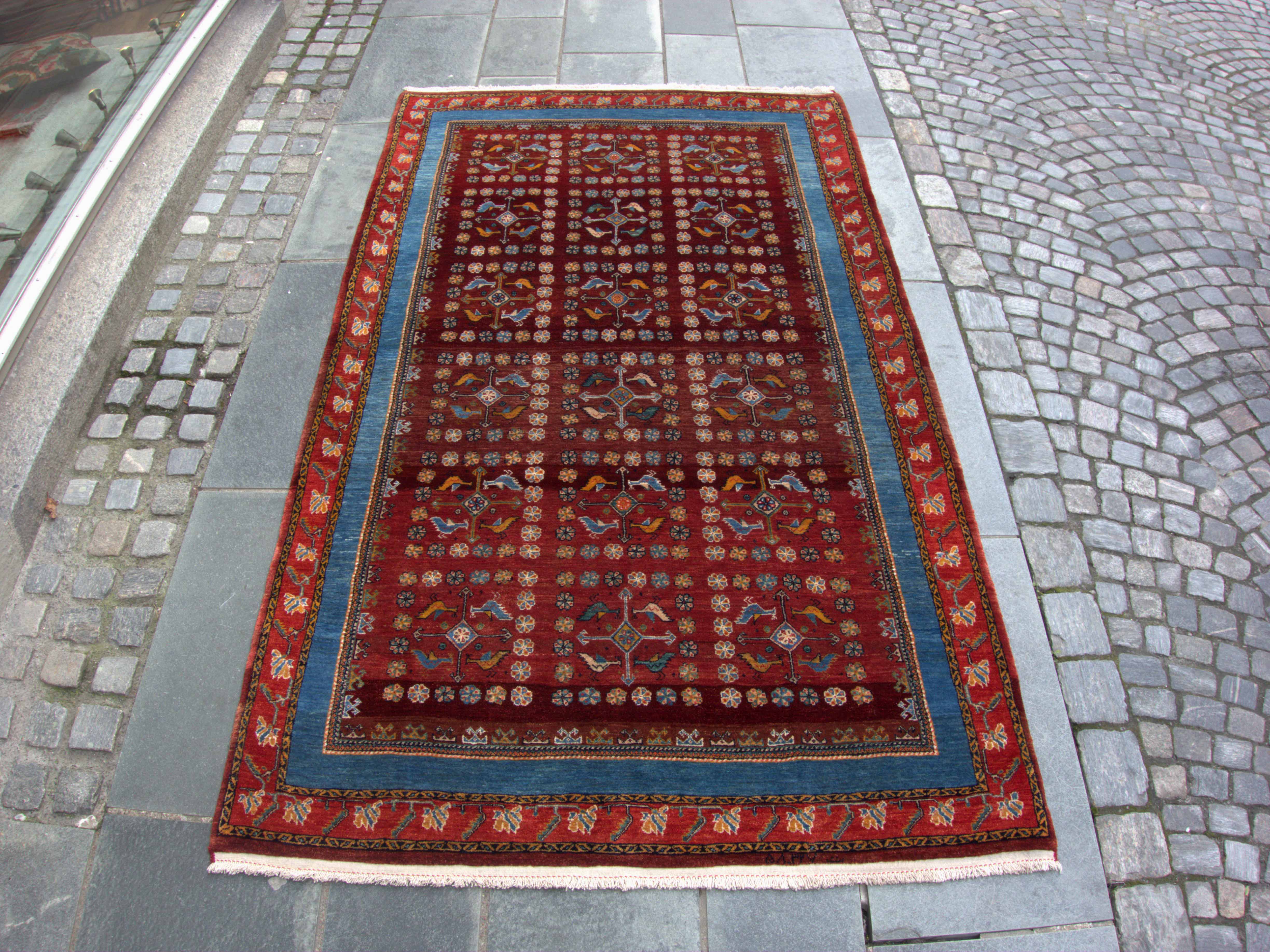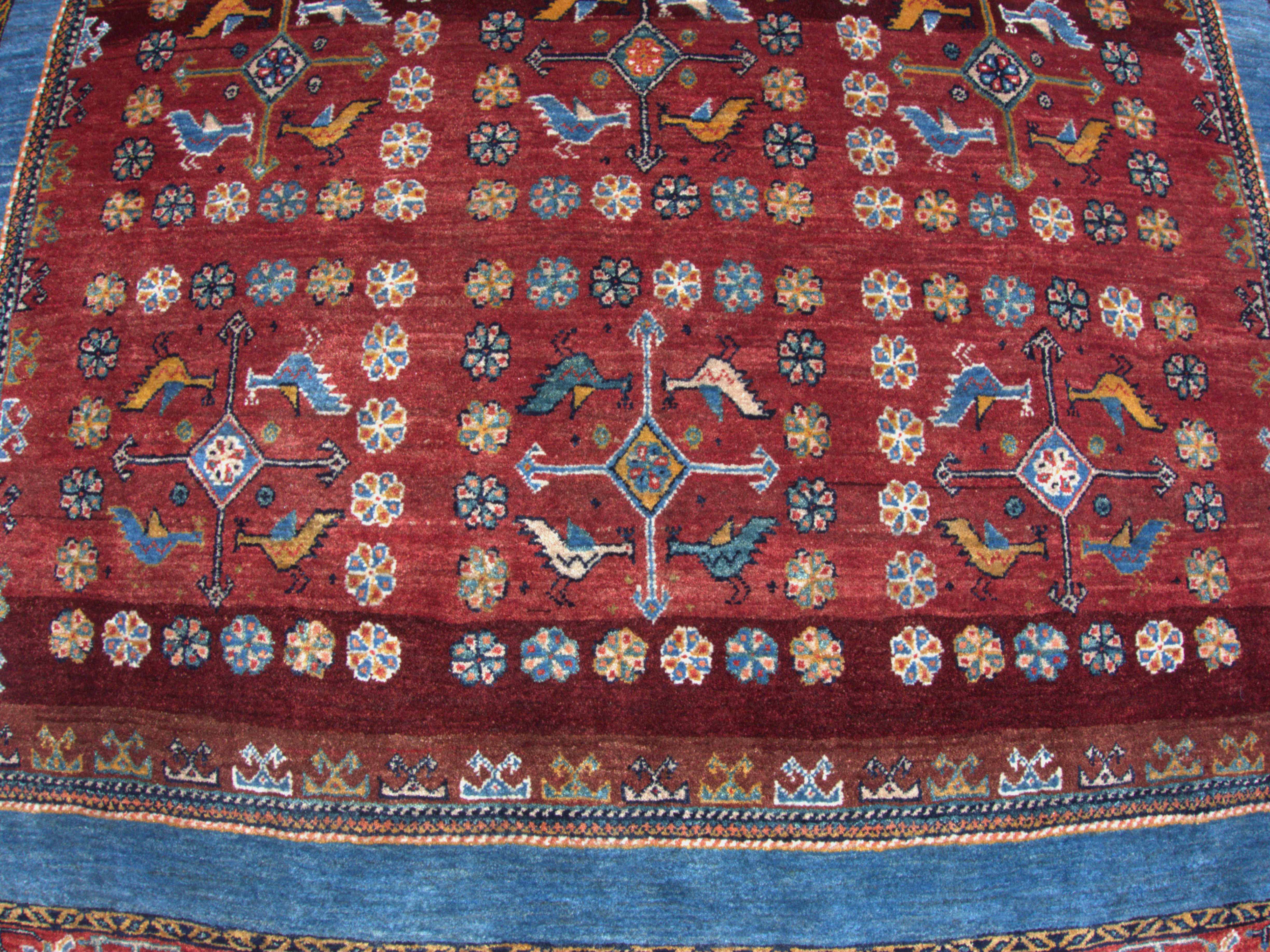 Sjeldent og vakkert teppe i utsøkt kvalitet. Hagemotiv med diamant og fugler, omkranset av bord i blåfarger.