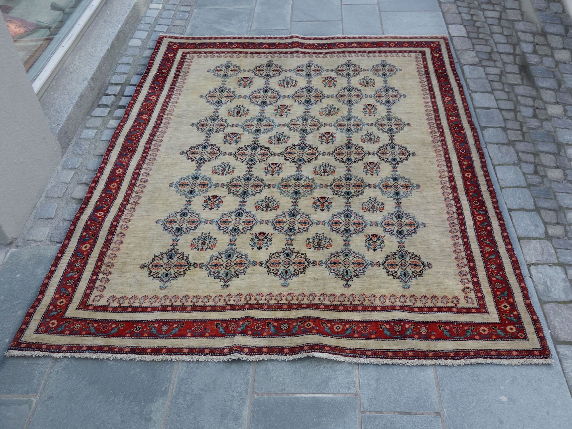 Dette Gashgooli er et gammelt vakkert og unikt teppe i plantefarget håndspunnet ull fra Shiraz området (Sør Persia)