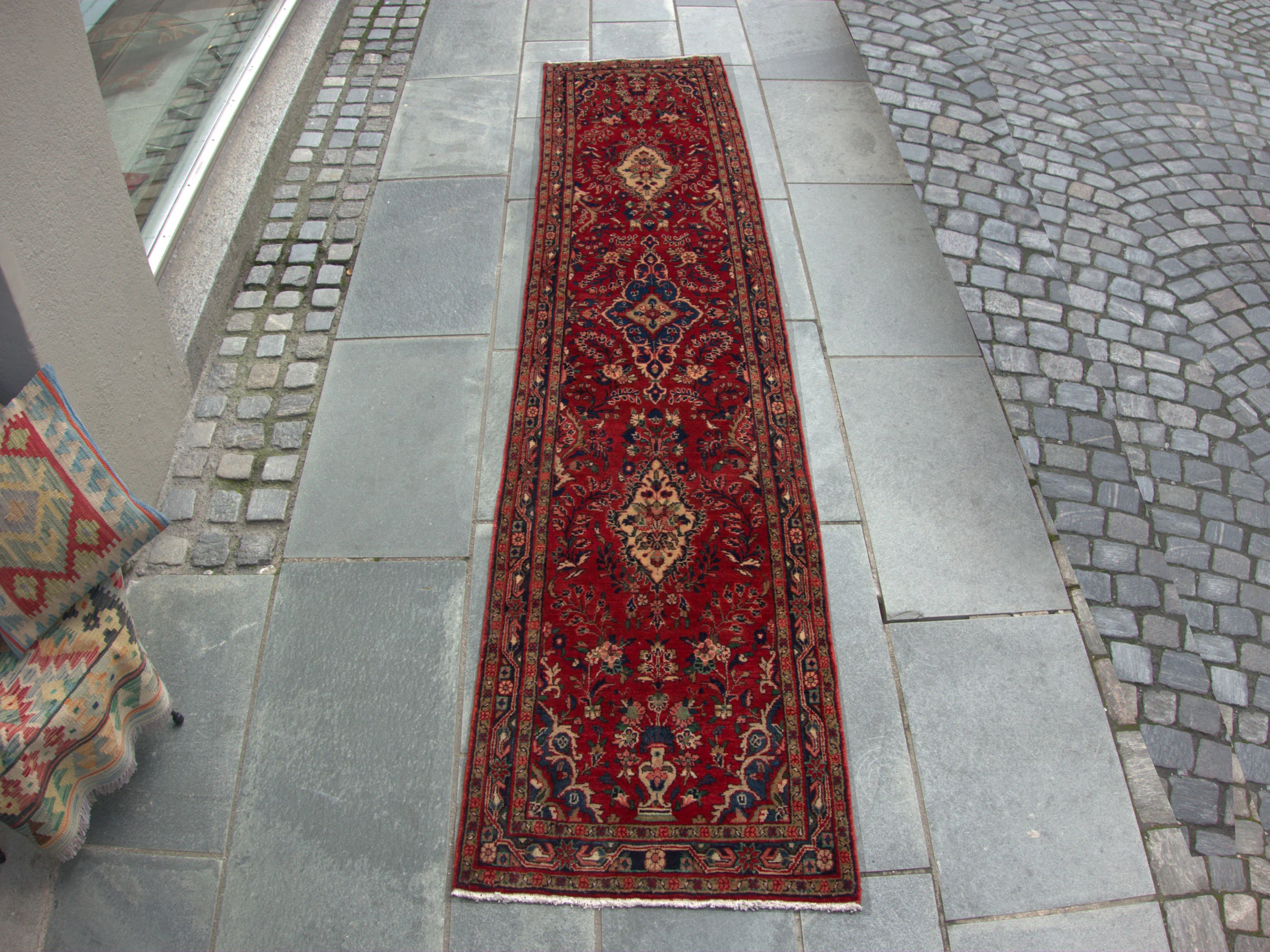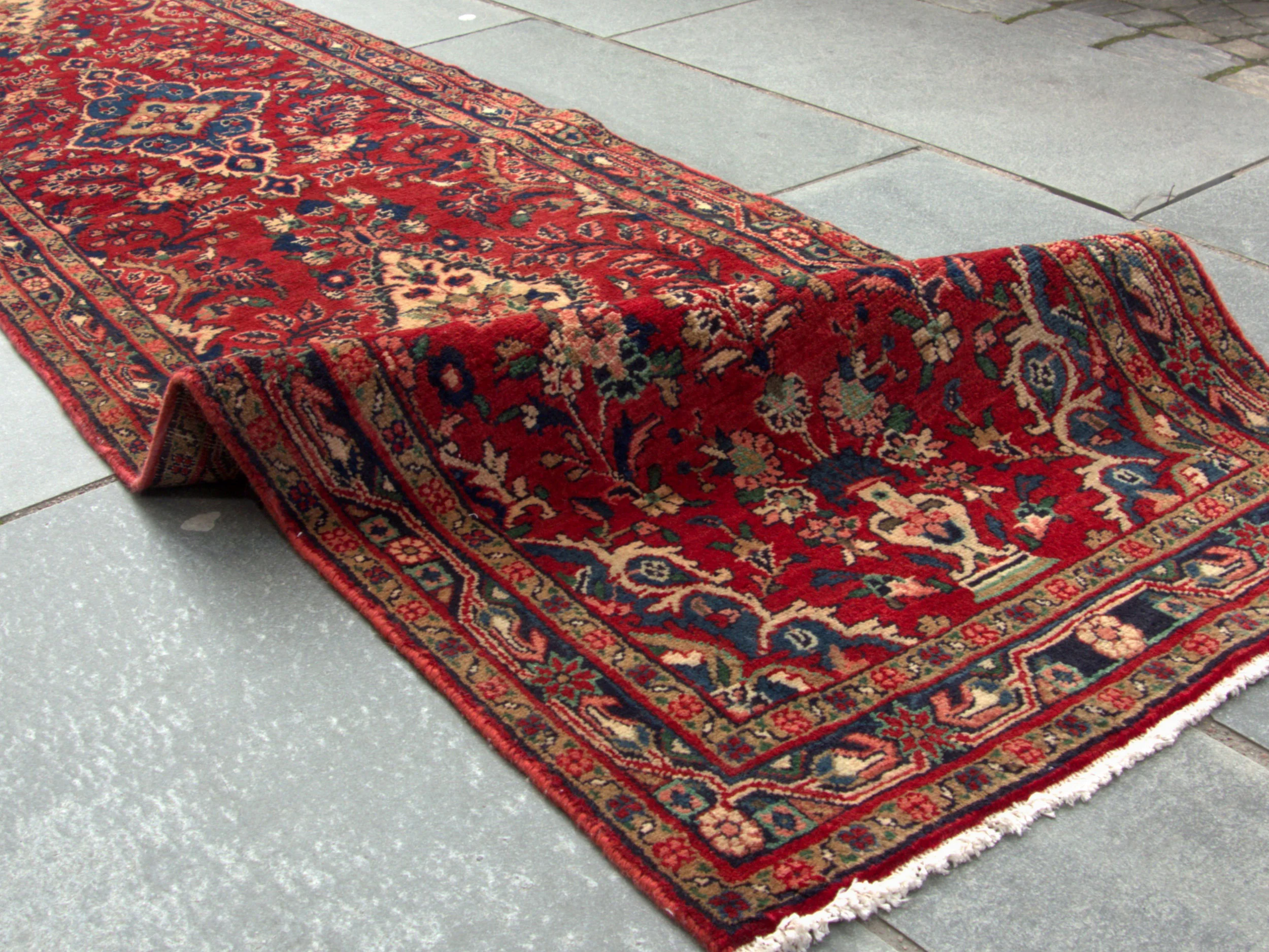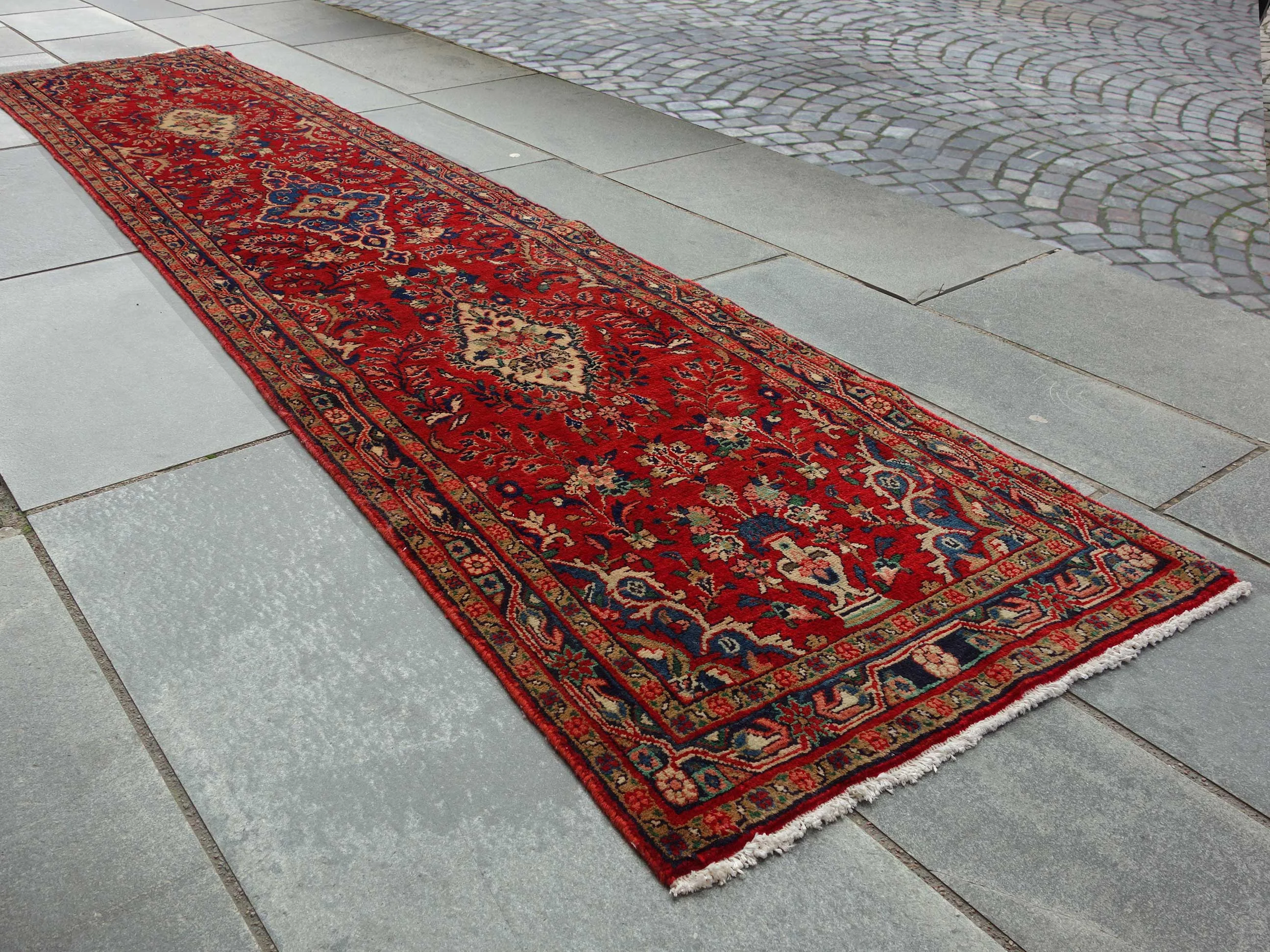 Vakker Hamadan med medaljong. Hamadan teppene er knyttet med ull luv og bomulls varp og veft. Mønstrene kan best beskrives som landlige tolkninger av klassiske mønstre, med en sentral medaljong og hjørner. De har varme farger, forskjellige nyanser av rødt, så vel som brunt, blått og grønt.