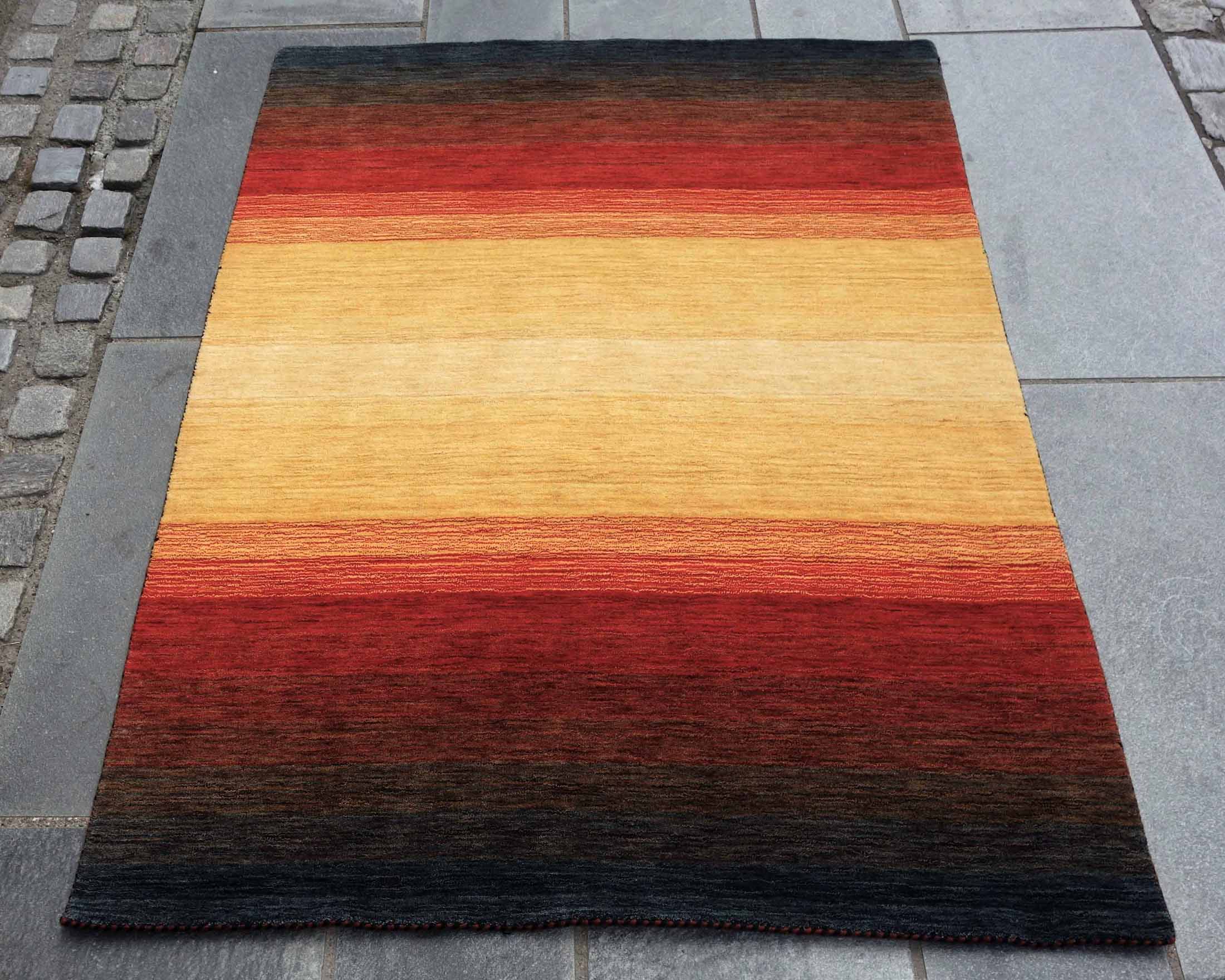 I dette Panorama designet er fargen i sort og rød som går over i gyllen-beige på midten. Panorama er et stilrent design-teppe som passer til vår skandinaviske stil.