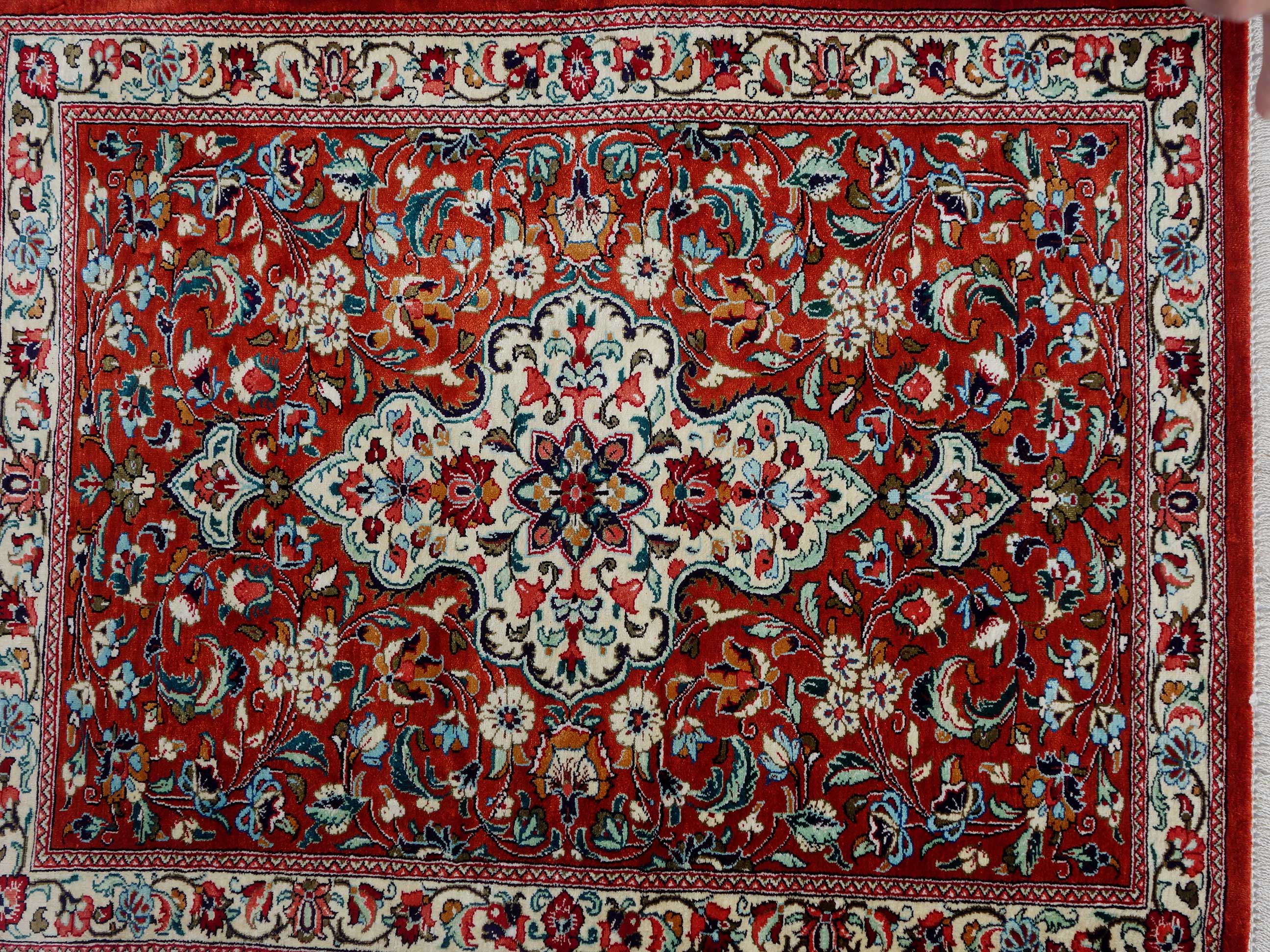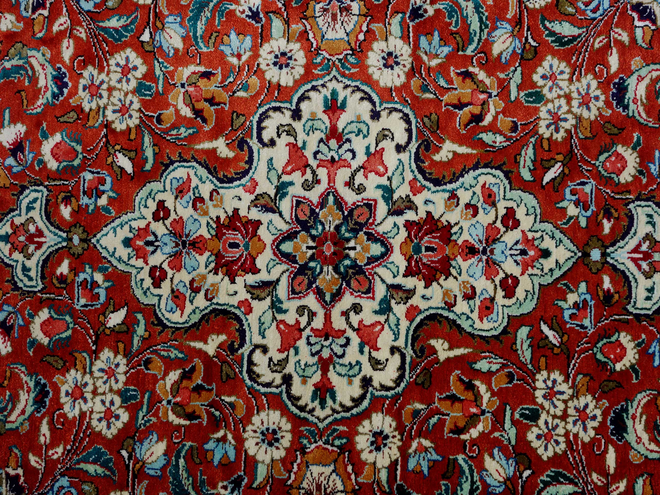 Dette er et vakkert og sjeldent teppe fra Qum i silke. Sofistikert i klassisk medaljong. Natur-silken fra Qum er kjent over hele verden for sin høye kvalitet. Qum (Qom) tepper blir knyttet i verksteder med de fineste mønstre og ornamenter. Med en knutetetthet på 1000 000 per kvadratmeter er Qum-teppene av meget fin kvalitet og kanskje de mest sofistikerte av alle persiske tepper.