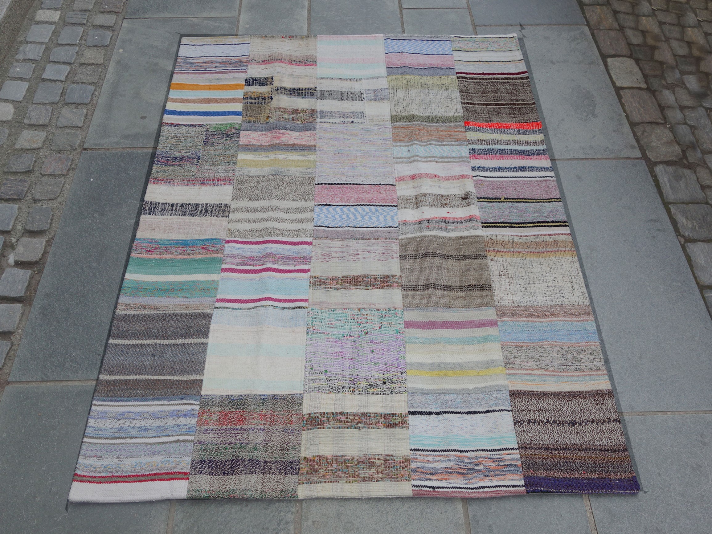 Tyrkisk patchwork i kelim. Gjenbruk av gamle kelimtepper og ryetepper i nytt harmoniske design i duse farger.