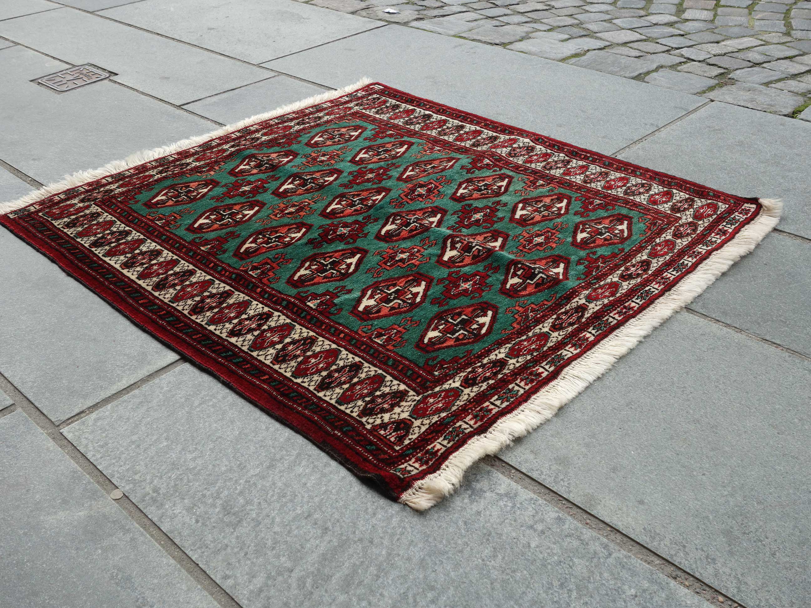 Sjelden vakker gammel Turkman. Dette er et smykke på gulvet i dype kraftfulle farger. Torkaman teppene er av høy kvalitet og det kan også forekomme silke i luven. Mønsteret er tradisjonelle, med göler og ofte brede border på kortsidene.. Rødt i hele skalaen fra fiolett til brunt, er en dominerende farge som brukes eksklusivt av turkmenerne. Teppet er av utmerket håndverk.